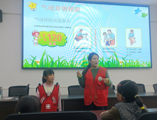 在講授環(huán)節(jié),老師用課件, 動(dòng)畫短片講授“氣道異物梗阻”“溺水”“中暑”等日常場(chǎng)景風(fēng)險(xiǎn),搭配朗朗上口的安全口訣,讓孩子快速記憶。