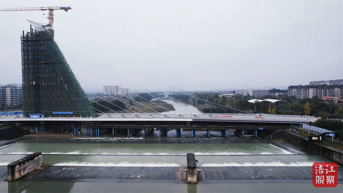 11月11日,記者在現(xiàn)場看到,十多名工人正在進(jìn)行橋面鋪裝、引橋段施工等收尾工作。調(diào)元大橋橫跨安昌河,全長約267米,橋?qū)?9米,是連接河西片區(qū)與河?xùn)|新區(qū)的重要通道。大橋采用獨(dú)塔單索面無背索斜拉橋設(shè)計(jì),橋塔高聳如鶴頸,拉索如翼,勾勒出“云鶴飛揚(yáng)”的靈動(dòng)畫卷。