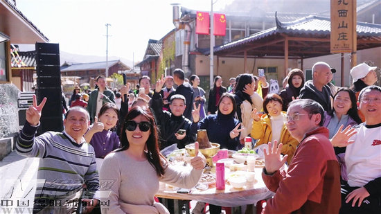 臨近正午,備受期待的長街宴正式開席。近30張圓桌沿主干道整齊排開,與遠(yuǎn)山彩林相映成趣,構(gòu)成一幅極具煙火氣的民俗畫卷。桌上銅火鍋炭火正旺,清亮高湯翻滾沸騰,新鮮牦牛肉、牦牛肚搭配本地高山菌和時(shí)令蔬菜,鮮香撲鼻。白馬青年為游客獻(xiàn)上最高待客禮節(jié)“篩糠”,眾人合力將游客輕輕拋起,寓意“拋去塵囂煩惱”;隨后,他們唱響嘹亮的敬酒歌,捧上醇厚青稞酒,舉杯共飲間,賓客與主人的情誼悄然升溫。“這里的風(fēng)土人情特別獨(dú)特,牦牛火鍋鮮香入味,平武山好水好人更熱情,不愧是天然氧吧。”游客任沛熹難掩喜愛之情。