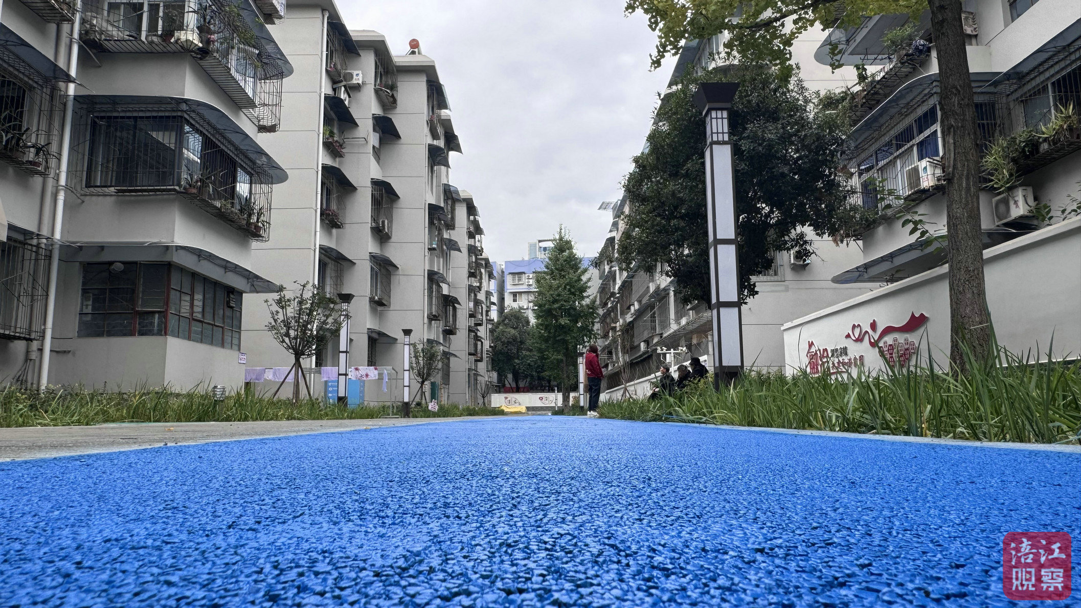 “一建”步道。漫步小區(qū),一條蔚藍色透水混凝土步道如絲帶般串聯(lián)起各個樓棟,與大面積鋪設的陶瓷透水磚相映成趣,共同構(gòu)筑起“會呼吸”的地面系統(tǒng)。