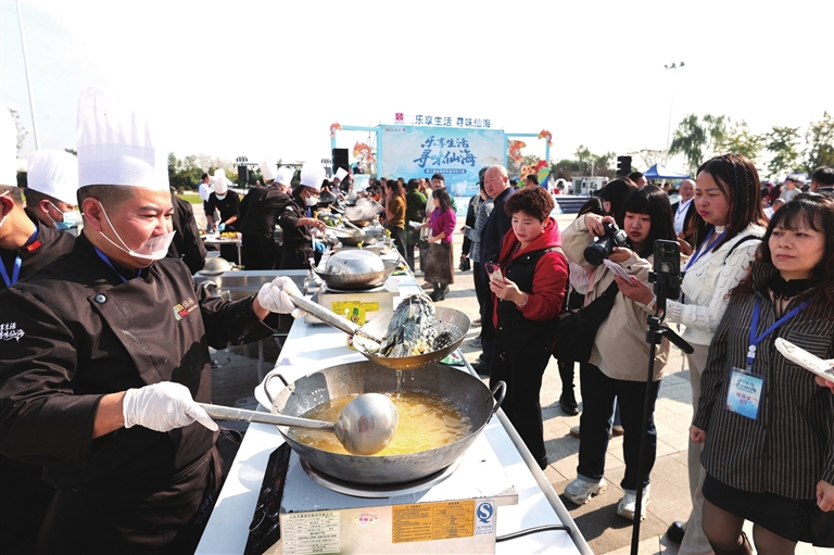 賽場外,多元互動活動人氣爆棚。中國烹飪大師蒙眼展示切腰花絕技,刀工精準(zhǔn)利落,盡顯匠心魅力;20公斤以上的鮮活仙海大魚競拍環(huán)節(jié),餐飲企業(yè)爭相舉牌;展區(qū)內(nèi),仙海名特優(yōu)產(chǎn)品整齊陳列,本地特色美食供游客免費品鑒,讓大家一站式感受仙海風(fēng)味;由參賽菜品組成的20桌“全魚宴”更是座無虛席,游客在品嘗美味的同時,盡享視覺與味覺的雙重盛宴。