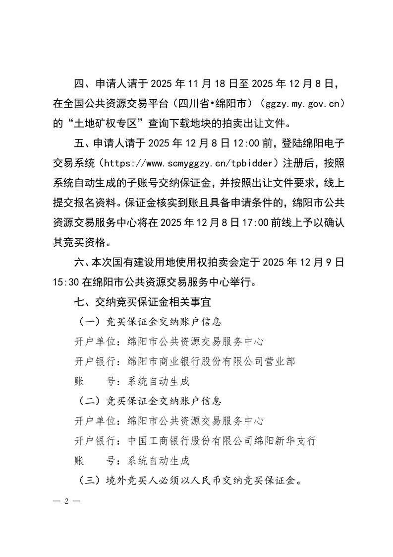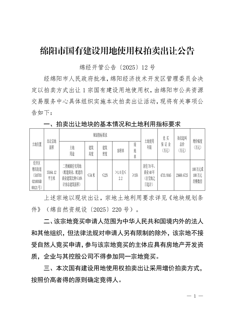 綿陽(yáng)市國(guó)有建設(shè)用地使用權(quán)拍賣(mài)出讓公告(綿經(jīng)開(kāi)管公告〔2025〕12號(hào))