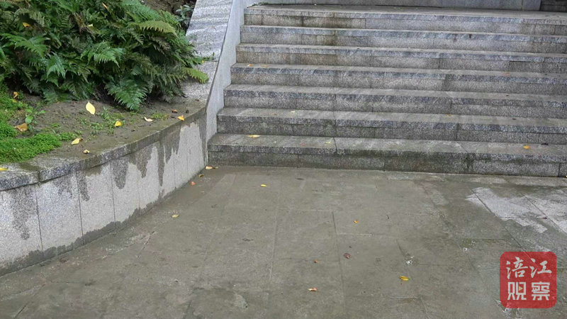 天橋下的臺(tái)階則是另一處“重災(zāi)區(qū)”。記者看到,臺(tái)階表面幾乎被旁邊綠化帶溢出的泥土覆蓋,部分區(qū)域同樣長(zhǎng)了青苔,踩上去黏滑泥濘,行走十分困難。“這邊更滑!泥巴都濺到地面上了,根本不敢走。”一位市民指著臺(tái)階無奈說道。