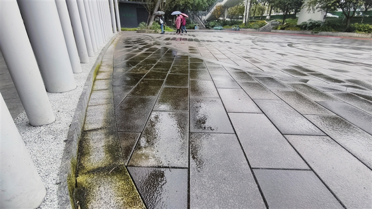 近日,一場雨后,記者實(shí)地探訪發(fā)現(xiàn),該處廣場廊架下的地磚表面附著明顯青苔,雨水浸潤后更顯濕滑,多位市民向記者反映:“幾乎每天都有人在這里摔倒。”