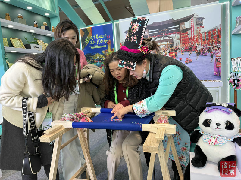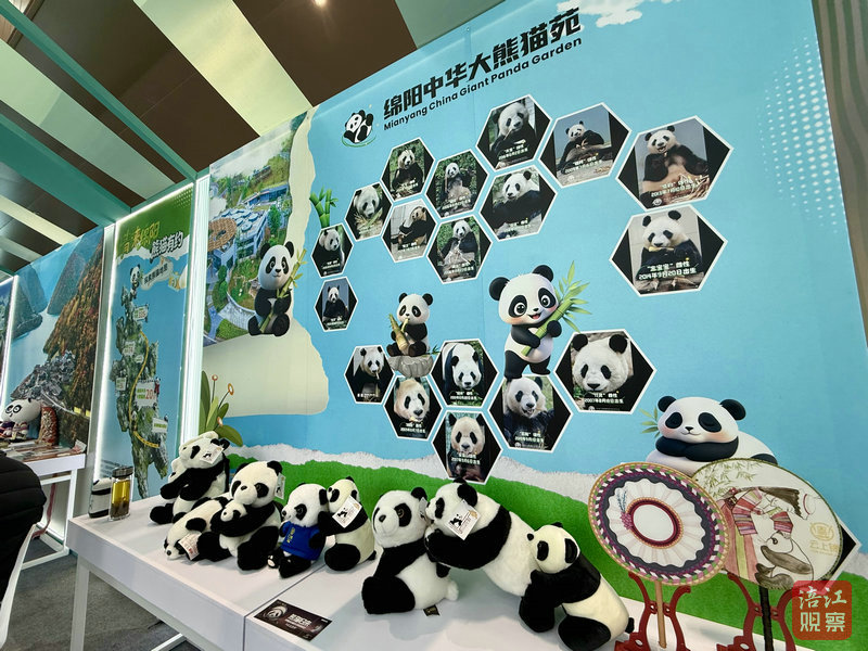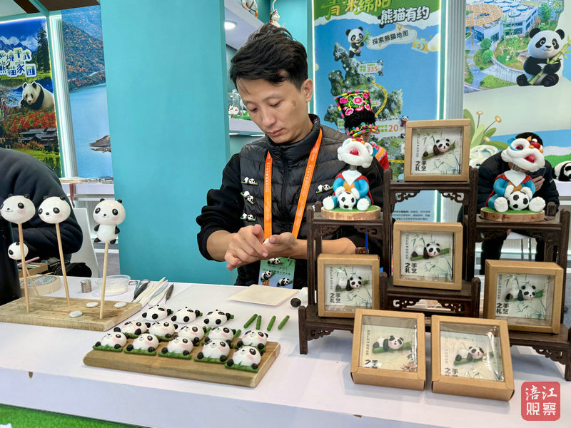 在展區(qū)一側(cè),綿陽以“青睞綿陽 熊貓有約”文旅品牌為主題,共設(shè)置了綿陽中華大熊貓?jiān)贰⑵轿?、北川三個(gè)展位,攜非遺項(xiàng)目活態(tài)展演和200多件文創(chuàng)產(chǎn)品亮相。從剪紙到羌繡,從面塑到草編,從手辦到潮玩,創(chuàng)意無窮的熊貓形象,充分展示了綿陽對(duì)熊貓IP的無限想象力,現(xiàn)場(chǎng)氣氛熱烈,吸引眾多國(guó)內(nèi)外嘉賓駐足參觀。