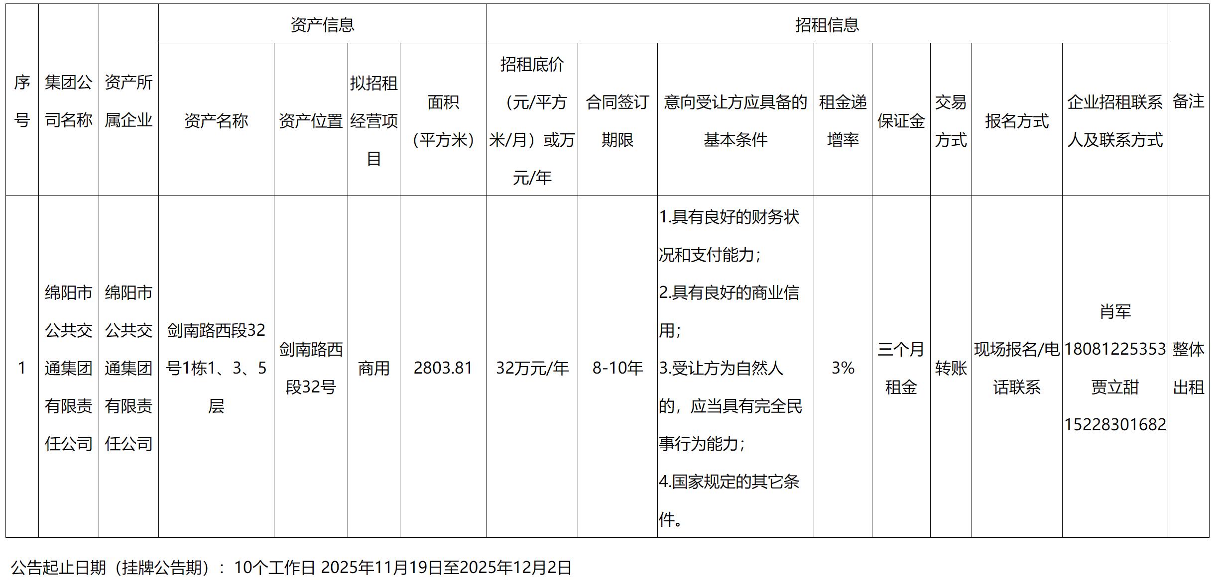 2025年綿陽(yáng)市公共交通集團(tuán)有限責(zé)任公司資產(chǎn)出租公告(11月)