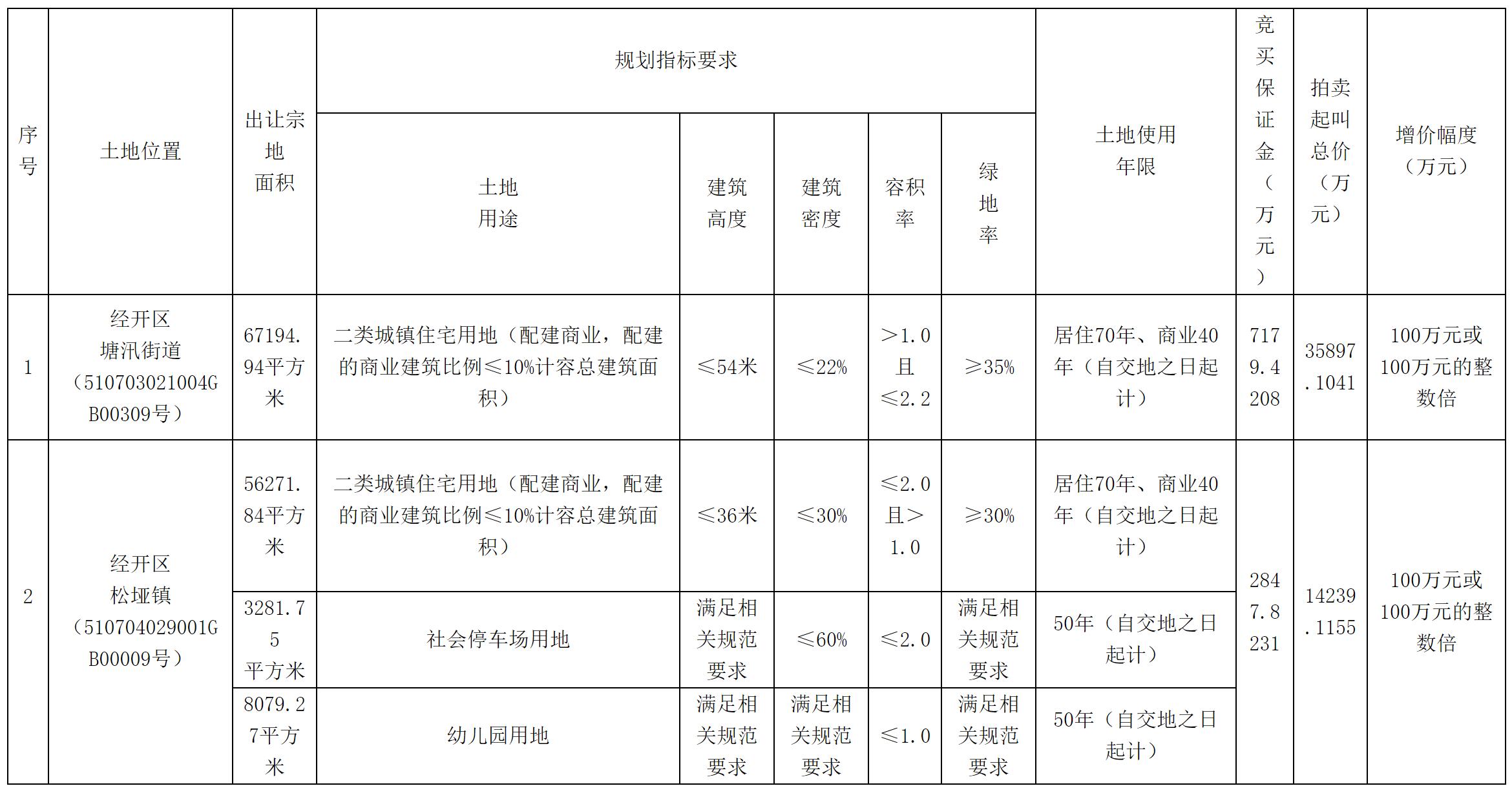 經(jīng)綿陽市人民政府批準(zhǔn),綿陽經(jīng)濟(jì)技術(shù)開發(fā)區(qū)管理委員會(huì)決定以拍賣方式出讓2宗國有建設(shè)用地使用權(quán),綿陽市公共資源交易服務(wù)中心具體組織實(shí)施本次拍賣出讓活動(dòng),現(xiàn)將有關(guān)事項(xiàng)公告如下: