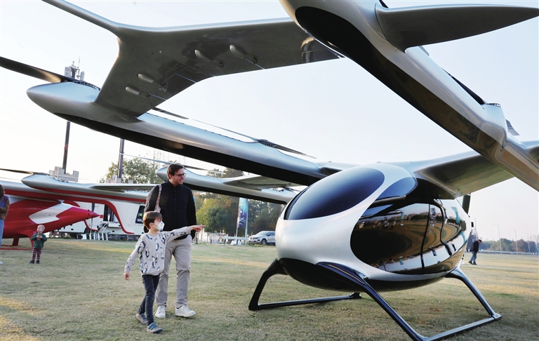 11月22日,在峰飛航空全球科技日活動上,人們觀看電動垂直起降飛行器。 新華社記者 方喆 攝