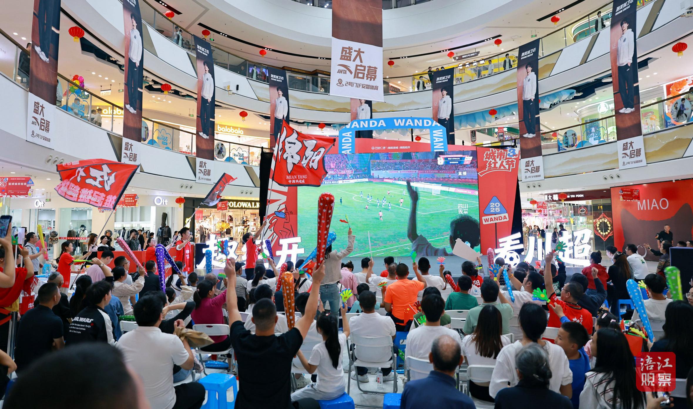 10月7日晚,川超聯(lián)賽綿陽九洲長虹隊主場對陣德陽重裝隊。球迷聚集在第二觀賽點經(jīng)開萬達廣場,為綿陽隊吶喊助威。