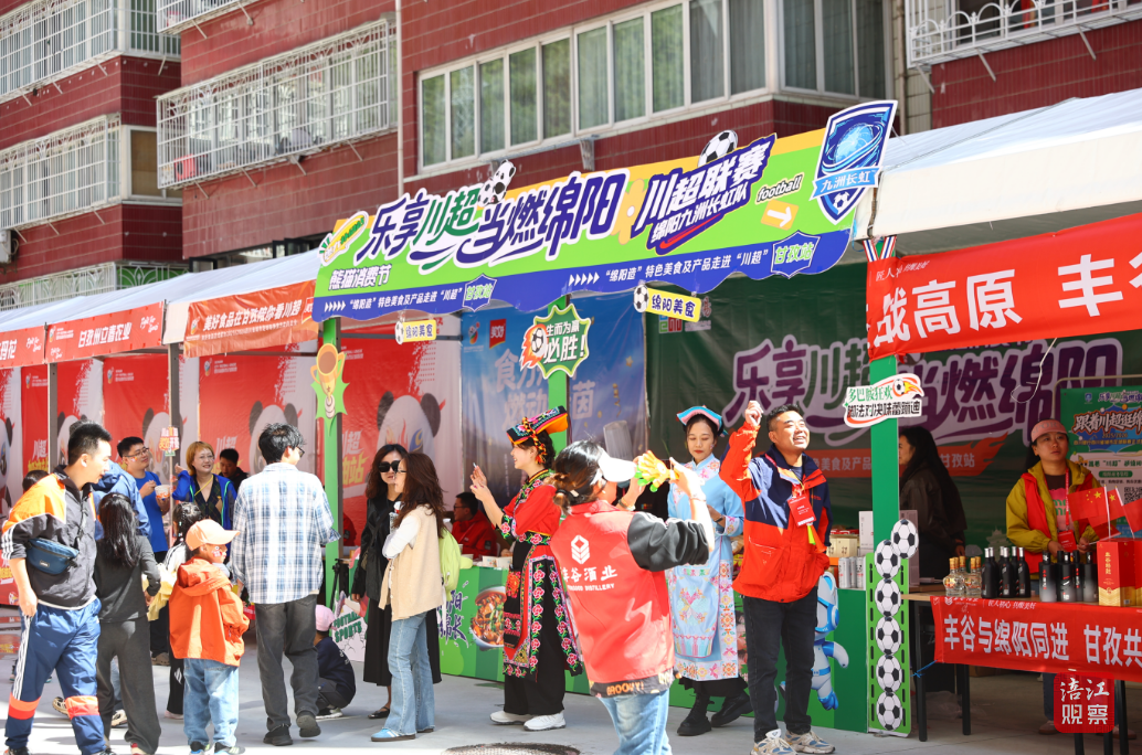 ●客場對陣甘孜時,“樂享川超 當燃綿陽”特色展區(qū)驚艷亮相,綿陽米粉、江油肥腸等好物走進川西;