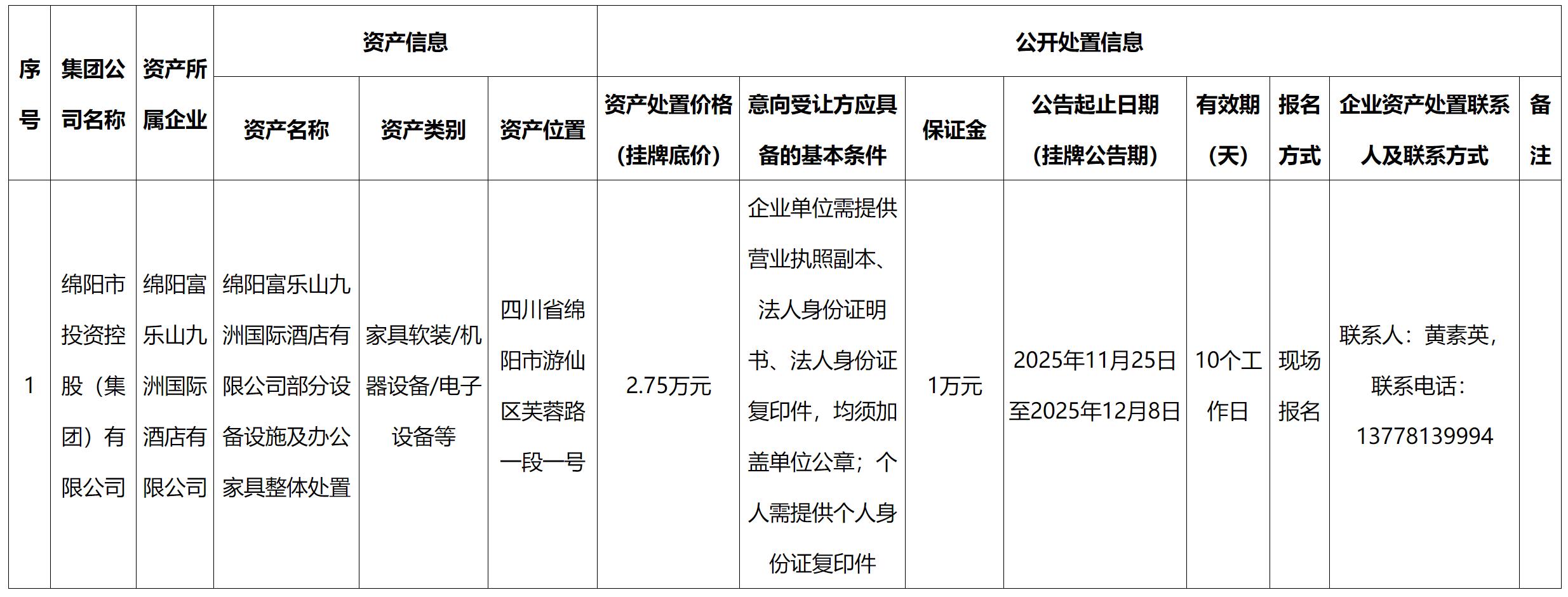 綿陽富樂山九洲國際酒店有限公司資產(chǎn)處置公告
