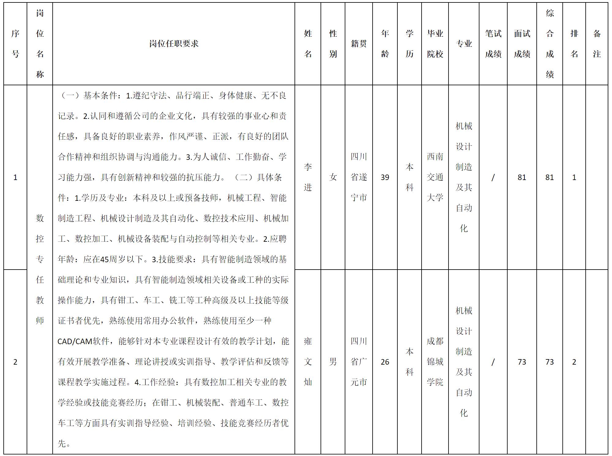 根據(jù)四川九洲教育投資管理有限公司發(fā)布的招聘公告及招聘相關(guān)規(guī)定,現(xiàn)將測試成績予以公示。