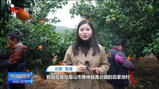記者 施源:現(xiàn)在正值晚熟柑橘的豐收季,我現(xiàn)在是在眉山市青神縣高臺鎮(zhèn)的百家池村。這里有一個晚熟柑橘基地,柑橘品種多達(dá)9種,而種植面積達(dá)3000多畝。