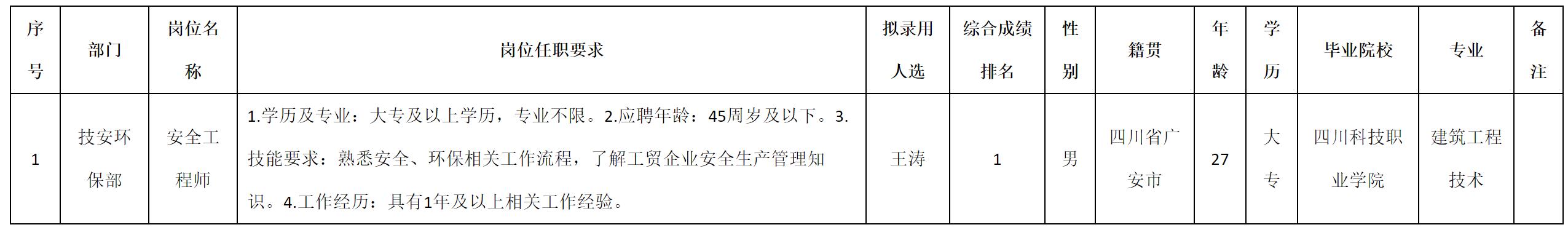 根據(jù)四川九州光電子技術(shù)有限公司發(fā)布的招聘公告及招聘相關(guān)規(guī)定,經(jīng)測(cè)試、考察、體檢等程序,擬錄用王濤同志到四川九州光電子技術(shù)有限公司工作,現(xiàn)予以公示,具體情況如下: