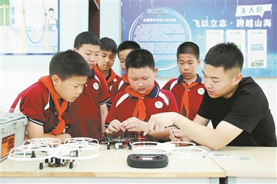 江蘇省宿遷市洋河新區(qū)實驗小學(xué)師生進行無人機組裝與拆卸維修。 視覺中國供圖