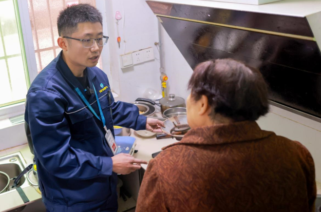活動期間,由燃?xì)獍矙z員與消防宣傳員混編組成聯(lián)合工作小組,挨家挨戶進(jìn)行走訪。入戶后,雙方人員分工明確,配合默契:燃?xì)夤景矙z員使用專業(yè)設(shè)備,對燃?xì)夤艿?、閥門、灶具、連接軟管等進(jìn)行全面“體檢”;消防宣傳員則重點檢查是否存在高危用火用電情況,講解消防安全知識及逃生自救方法。