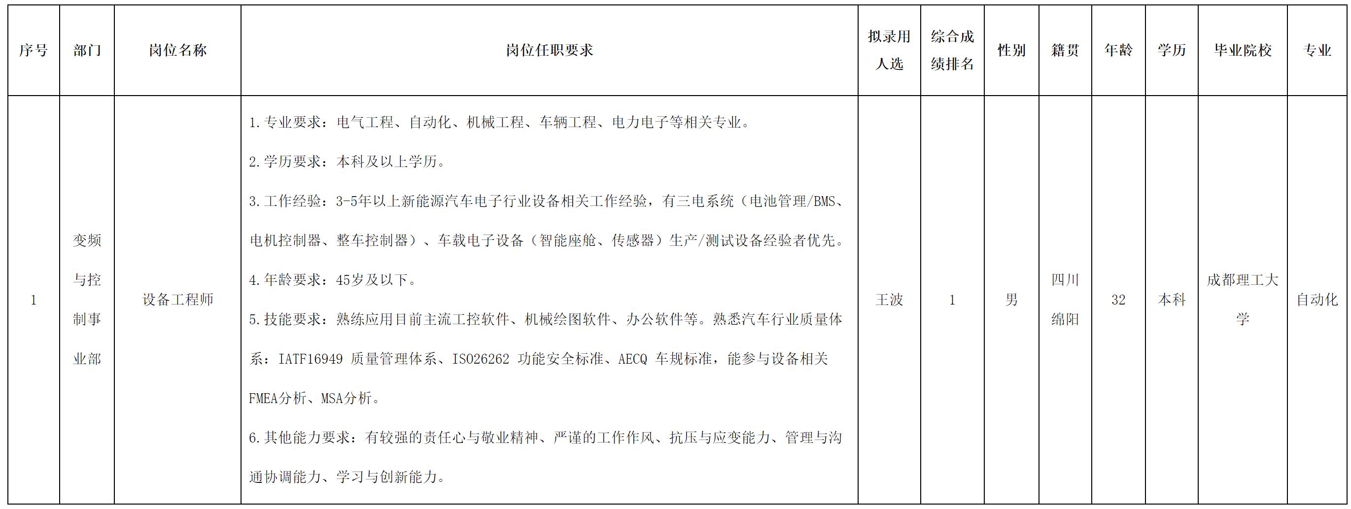 根據(jù)四川愛創(chuàng)科技有限公司發(fā)布的招聘公告及招聘相關(guān)規(guī)定,經(jīng)面試、考察、體檢等程序,擬錄用王波同志到變頻與控制事業(yè)部工作,現(xiàn)予以公示,具體情況如: