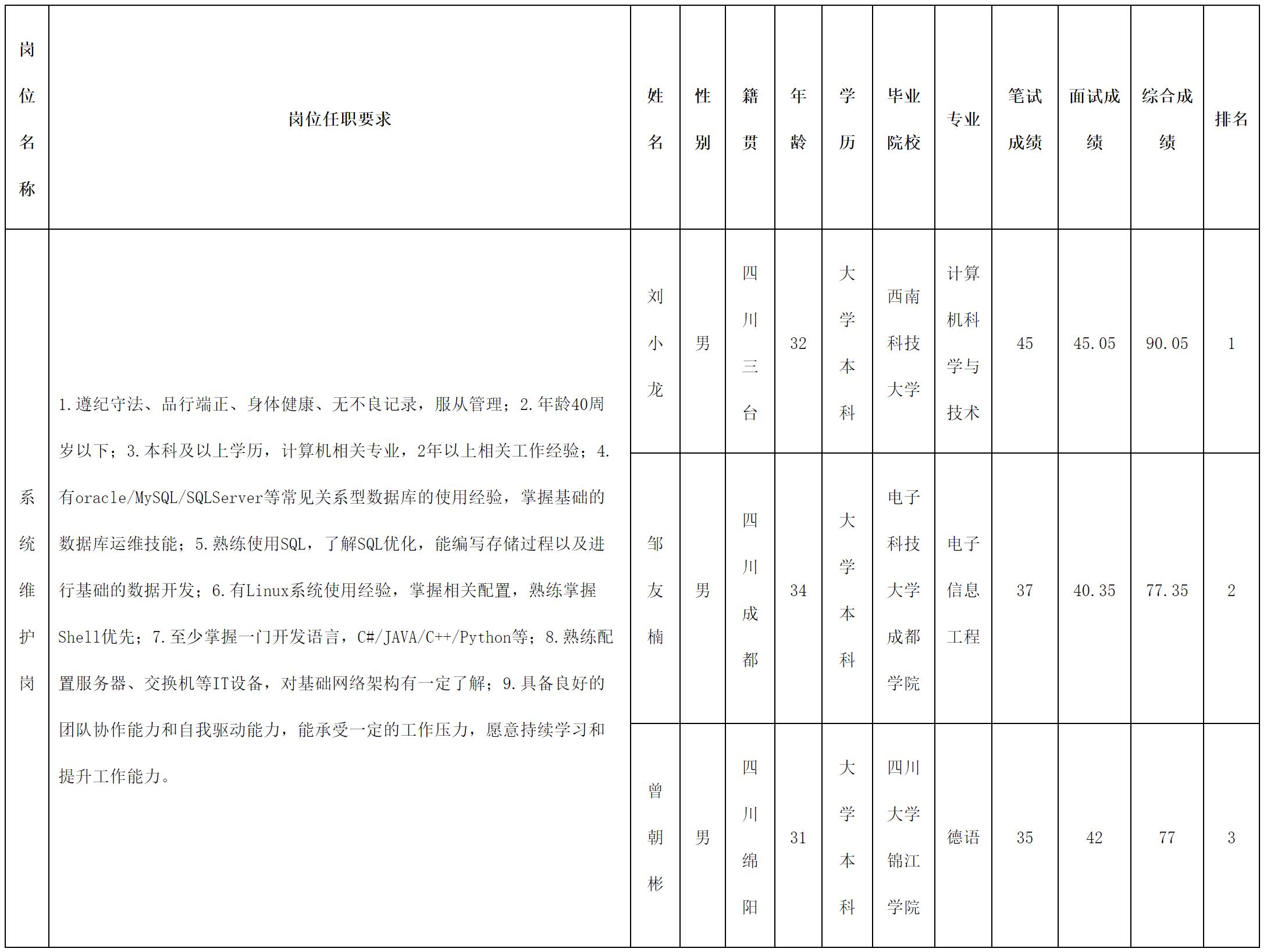 根據(jù)綿陽市綿州通科技有限責(zé)任公司發(fā)布的招聘公告及招聘相關(guān)規(guī)定,經(jīng)筆試、面試等程序,現(xiàn)將筆試、面試成績予以公示: