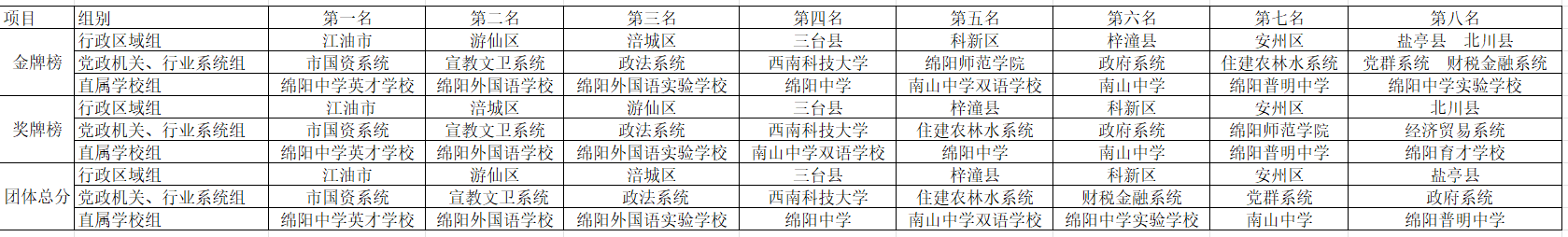 其中,江油市、綿陽市國資系統(tǒng)、綿陽中學(xué)英才學(xué)校成績亮眼,包攬各組別金牌榜、獎(jiǎng)牌榜、團(tuán)體總分三項(xiàng)第一名。