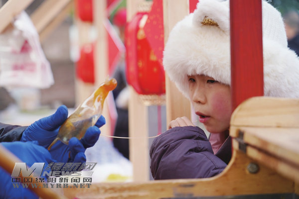 在潼川古城南外街的一家糖畫(huà)小攤邊,孩子們正認(rèn)真挑選著喜歡的圖案,完成后的糖畫(huà)在陽(yáng)光照耀下晶瑩剔透、閃閃發(fā)光。老板劉云一邊繪制著蛇形圖案的糖畫(huà),一邊介紹:“今年是蛇年,所以買(mǎi)蛇形圖案糖畫(huà)的顧客特別多,這幾天生意很好,一天能賣五六百元。”