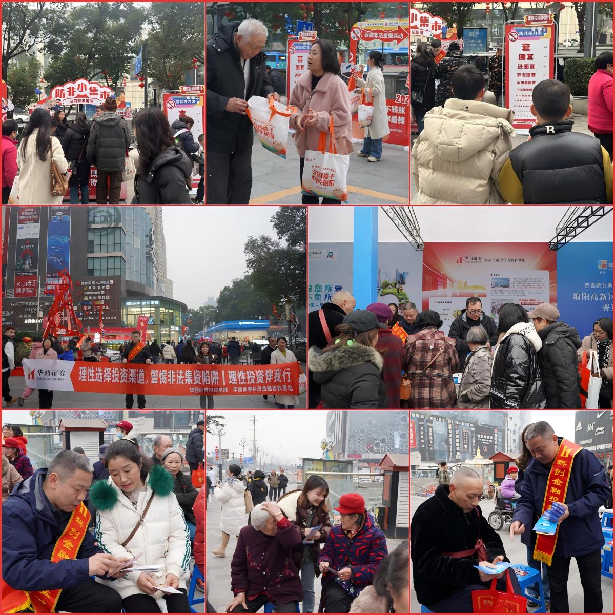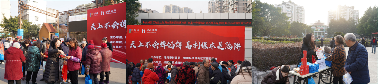 歲末年初是非法金融活動(dòng)的高發(fā)期,為切實(shí)做好歲末年初防范非法金融活動(dòng)宣傳教育工作,引導(dǎo)群眾遠(yuǎn)離非法金融,自覺(jué)防范非法金融,12月份以來(lái),在綿陽(yáng)市財(cái)政局、綿陽(yáng)市涪城區(qū)財(cái)政局、綿陽(yáng)科技城新區(qū)財(cái)政金融局以及綿陽(yáng)科技城財(cái)政金融國(guó)資局的指導(dǎo)下,華西證券投資者教育基地、華西證券科創(chuàng)金融投資者教育基地精心策劃并實(shí)施了一系列以“歲末年初,防范非法金融活動(dòng)”為主題的教育宣傳活動(dòng),線下覆蓋數(shù)萬(wàn)人次,發(fā)放防非宣傳資料萬(wàn)余份。