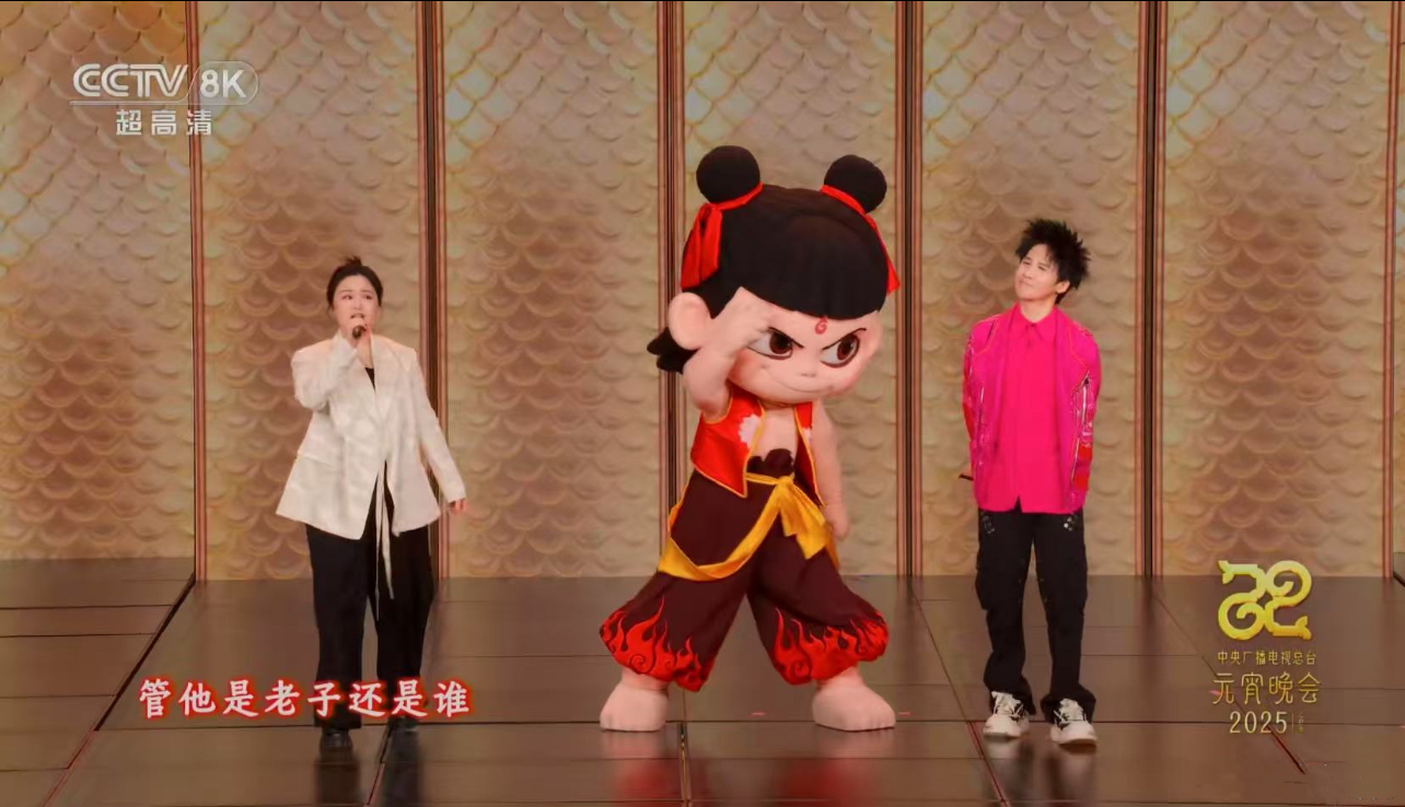 “金霞萬丈錦綾飄小小少年勢氣高。”開場歌舞后的首個節(jié)目便將鏡頭對準(zhǔn)了正在熱映的“成都造”動畫巨制《哪吒之魔童鬧海》。節(jié)目中,古靈精怪的哪吒和俊秀的敖丙人偶亮相舞臺,大張偉聯(lián)手電影中哪吒的配音演員、四川電影電視學(xué)院教師呂艷婷,帶領(lǐng)萌娃小哪吒們獻上歌舞《哪吒鬧元宵》,可愛爆棚。