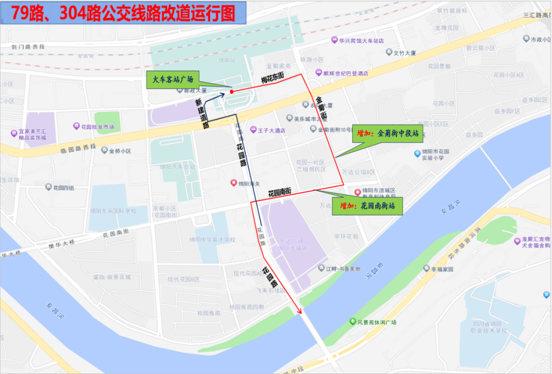 火車客站廣場—南郊機(jī)場。由火車客站廣場始發(fā),開往南郊機(jī)場方向,改道經(jīng)梅花東街、金菊街、花園南街至花園路回原線路運(yùn)行;開往火車客站廣場方向運(yùn)行路線不變。(304路不增加??空?
