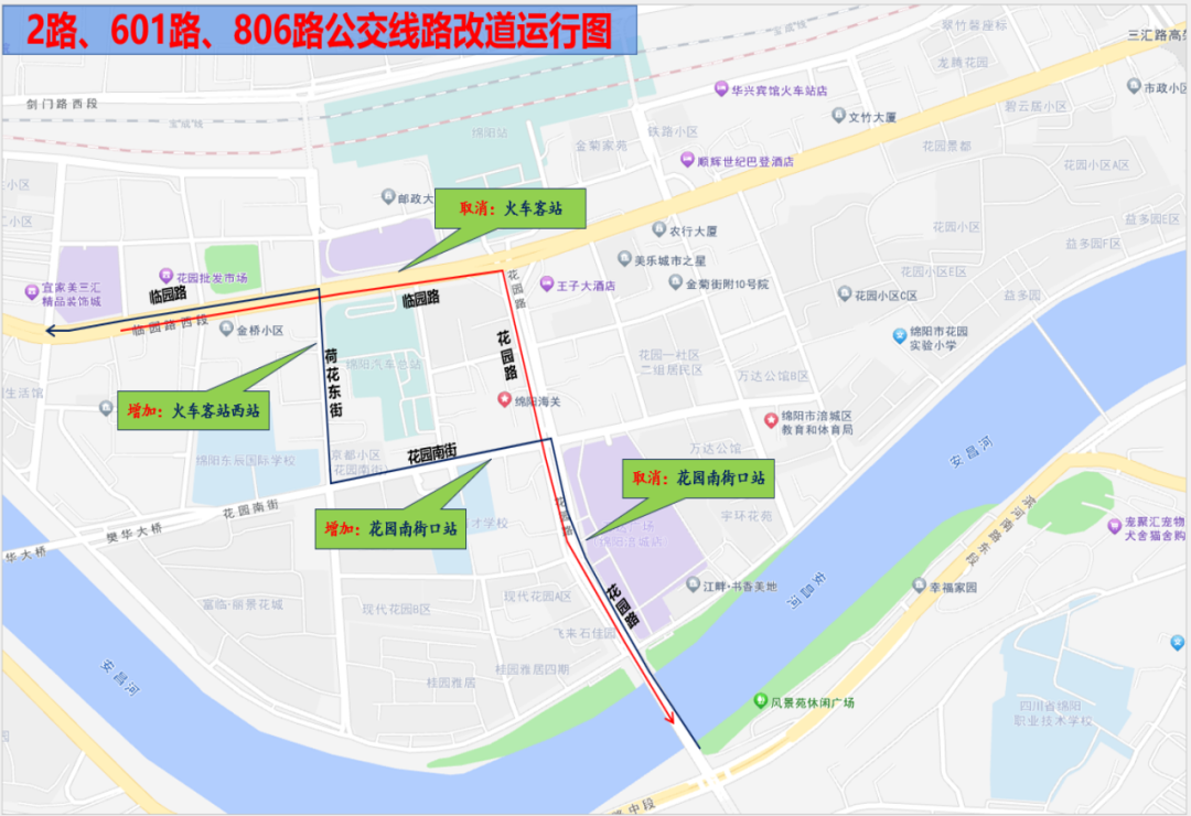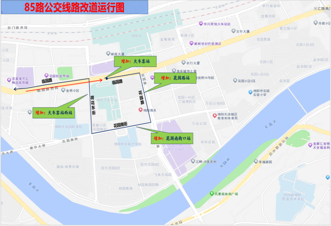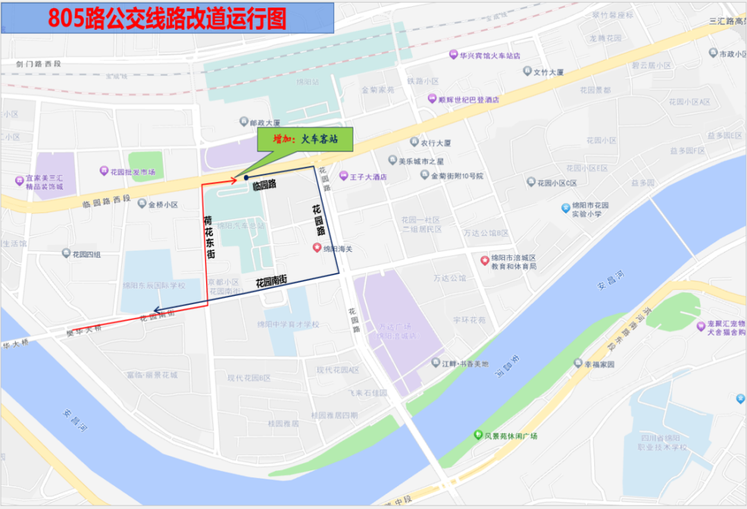 長虹智能產(chǎn)業(yè)園—火車客站(改道后)。開往火車客站方向,行至荷花東街??炕疖嚳驼疚髡竞?,改道經(jīng)臨園路至火車客站(汽車總站側(cè));返回經(jīng)花園路至花園南街回原線路運(yùn)行。