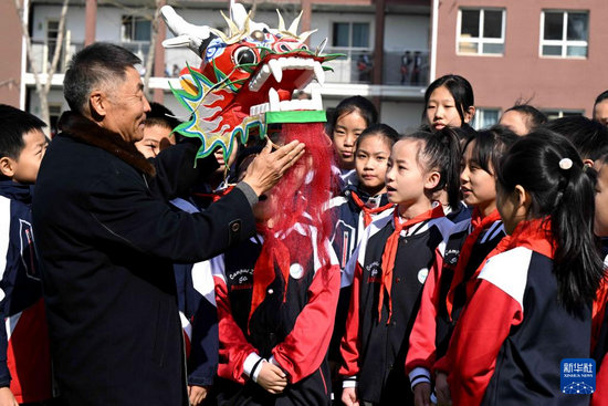 2月26日,王彥州在石家莊市草場(chǎng)街小學(xué)給孩子們講解龍風(fēng)箏制作技藝。