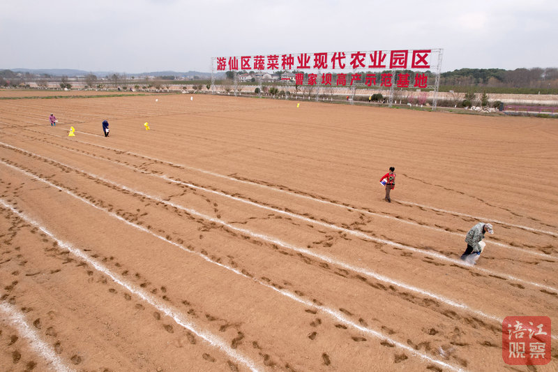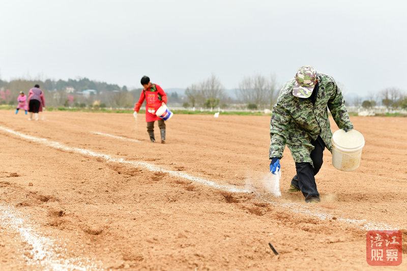 在油菜地的另一邊,農(nóng)戶們在忙著耕種,拉標(biāo)線、撒底肥……松軟的泥土中嵌進(jìn)一串串深淺不一的腳印。