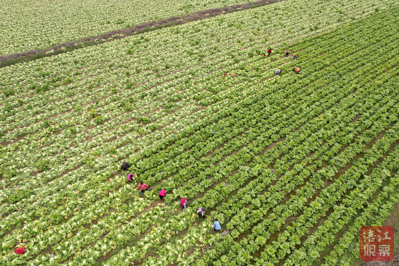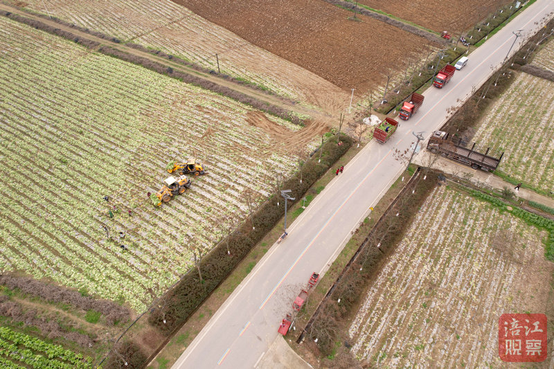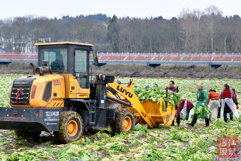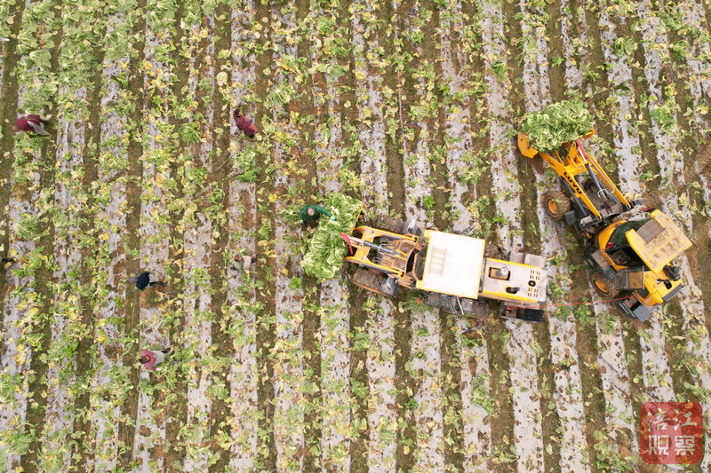 在芙蓉溪畔的勝黎村,20多位農(nóng)民正在搶收近百畝地的青菜。2臺裝載機(jī)及時將砍好的青菜裝進(jìn)路邊的大貨車,1臺大型農(nóng)耕機(jī)在被清空的菜地里來回穿梭……