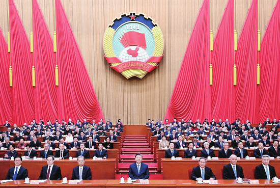 3月4日下午,中國人民政治協(xié)商會議第十四屆全國委員會第三次會議在北京人民大會堂開幕。這是習近平、李強、趙樂際、蔡奇、丁薛祥、李希、韓正在主席臺就座?!。ㄐ氯A社記者 謝環(huán)馳 攝)