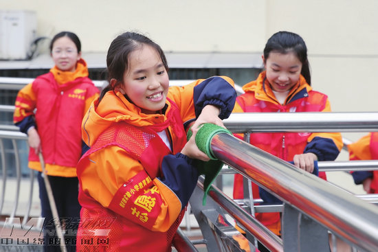 3月5日,綿陽市實(shí)驗(yàn)小學(xué)同學(xué)們?cè)谏鐓^(qū)清理護(hù)欄、拾撿雜物。(記者 陳冬冬攝)
