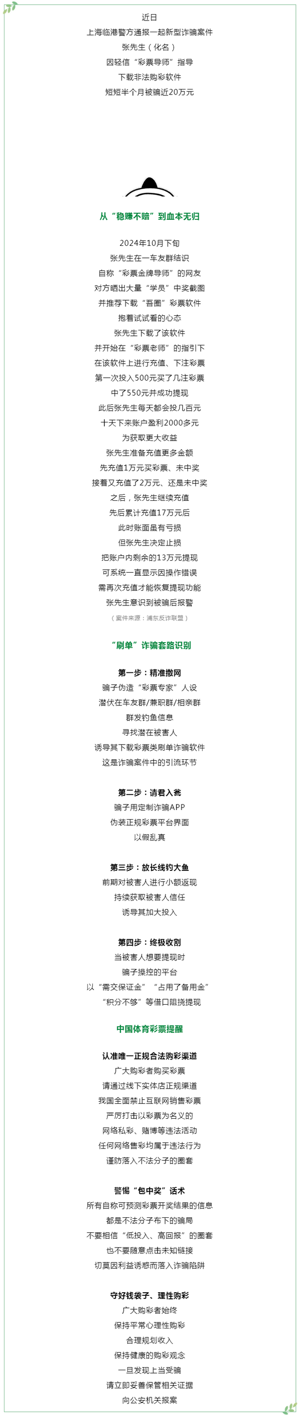 近日,上海臨港警方通報(bào)一起新型詐騙案件。張先生(化名)因輕信“彩票導(dǎo)師”指導(dǎo)下載非法購彩軟件,短短半個(gè)月被騙近20萬元。