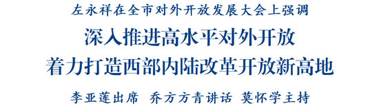 左永祥在講話中指出,黨的十八大以來,習(xí)近平總書記統(tǒng)籌國內(nèi)國際兩個(gè)大局,親自謀劃推動對外開放工作,創(chuàng)造性提出一系列新思想新觀點(diǎn)新論斷,特別是賦予四川構(gòu)筑向西開放戰(zhàn)略高地和參與國際競爭新基地的使命任務(wù),標(biāo)定了四川在全國開放大局中新的方位坐標(biāo)。省委、省政府堅(jiān)持把擴(kuò)大高水平對外開放作為治蜀興川的大事要事來抓,錨定“一高地一基地”目標(biāo)任務(wù),提出“西拓、南進(jìn)、東接、北融”的方針。全市上下要進(jìn)一步提高認(rèn)識、統(tǒng)一思想,切實(shí)增強(qiáng)高水平對外開放的責(zé)任感緊迫感,堅(jiān)持通道建設(shè)與平臺建設(shè)、穩(wěn)定出口與擴(kuò)大進(jìn)口、“引進(jìn)來”與“走出去”相結(jié)合,堅(jiān)定不移擴(kuò)大對外開放,積極服務(wù)和融入新發(fā)展格局,努力開創(chuàng)高水平開放引領(lǐng)高質(zhì)量發(fā)展新局面。