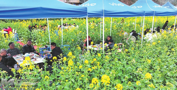 在距地面150米的空中俯瞰,萬畝油菜花田猶如巨幅金毯向天際鋪展,游人們搭乘的紅色直升機宛如穿行在金色海洋中的飛魚。這條特別設計的空中觀景航線給游客帶來云端瞰金浪的體驗。落地后,更令人驚喜的體驗在花田間等待游客——數(shù)十張方桌錯落擺放在油菜花海中,翻滾的紅油火鍋與搖曳的金黃花浪構成視覺盛宴,當?shù)厣碳彝瞥?ldquo;春日限定套餐”:現(xiàn)摘的油菜花嫩芽入湯提鮮,搭配現(xiàn)磨豆腐、手打糍粑等鄉(xiāng)間美味。