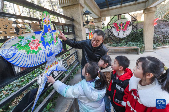 3月19日,中國(guó)風(fēng)箏協(xié)會(huì)理事金月強(qiáng)給孩子們介紹傳統(tǒng)風(fēng)箏的結(jié)構(gòu)和特點(diǎn)。
