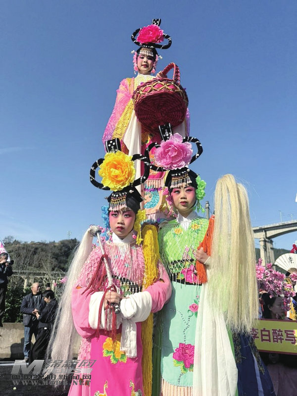 晨霧散開,明媚的陽光照射在緊張繁忙的綁扎現(xiàn)場。兩個小時后,《哪吒鬧海》《桃花仙子》《李白醉寫》《白蛇傳》四座高抬戲目完成綁扎,無論是腳踏風(fēng)火輪的“哪吒”,還是手提花籃的“桃花仙子”,或是醉握毛筆潑墨的“詩仙李白”,抑或是揮舞長袖的“白娘子”,當惟妙惟肖的“角兒”分別被四個身著戲服的壯漢抬起緩緩走向人潮涌動的古鎮(zhèn)長街時,驚嘆聲此起彼伏,人們紛紛舉起手機,定格這懸于半空之中“人不看戲、戲看人”的絕美畫面。