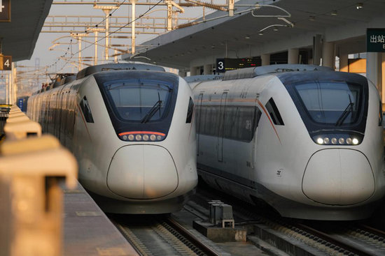 兩列城際列車在“四線貫通”后的佛莞城際官橋北站停靠。