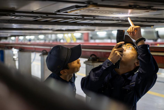 工作人員在惠州東動(dòng)車所對城際列車進(jìn)行檢修。
