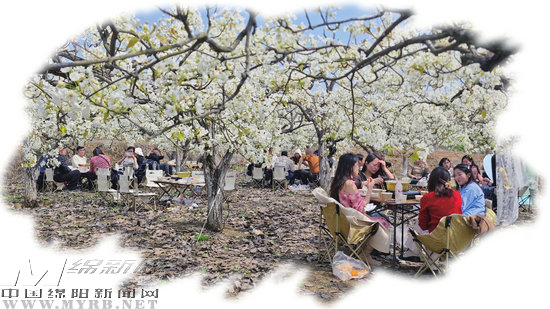 游客在梨樹下品茗、煮火鍋,享受悠閑時(shí)光。