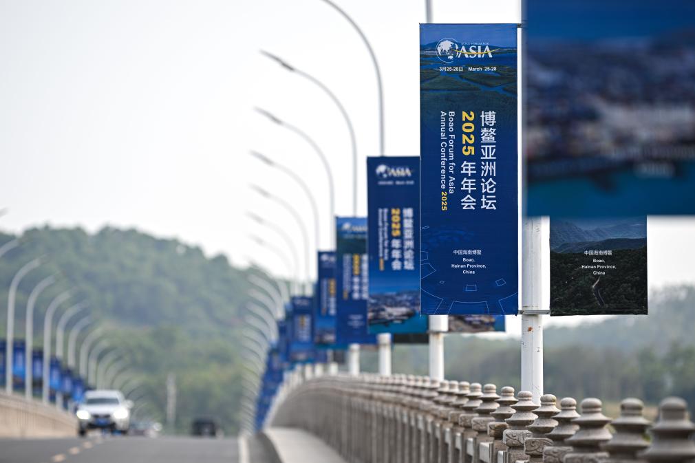 海南博鰲大樂大橋上的博鰲亞洲論壇2025年年會主題宣傳牌(3月20日攝)。新華社記者 蒲曉旭 攝