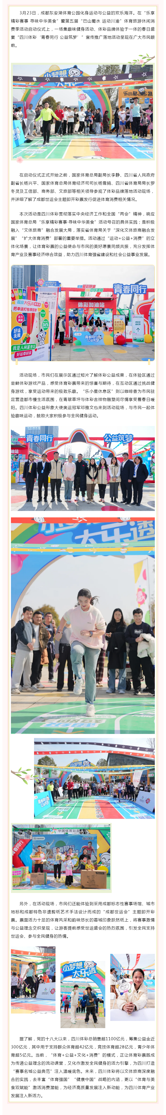 3月23日,成都東安湖體育公園化身運動與公益的歡樂海洋。在“樂享精彩賽事 尋味中華美食”暨第五屆“巴山蜀水 運動川渝”體育旅游休閑消費季活動啟動儀式上,一場集趣味健身活動、體彩品牌體驗于一體的春日盛宴“四川體彩‘青春同行 公益筑夢’”宣傳推廣落地活動呈現(xiàn)在廣大市民眼前。