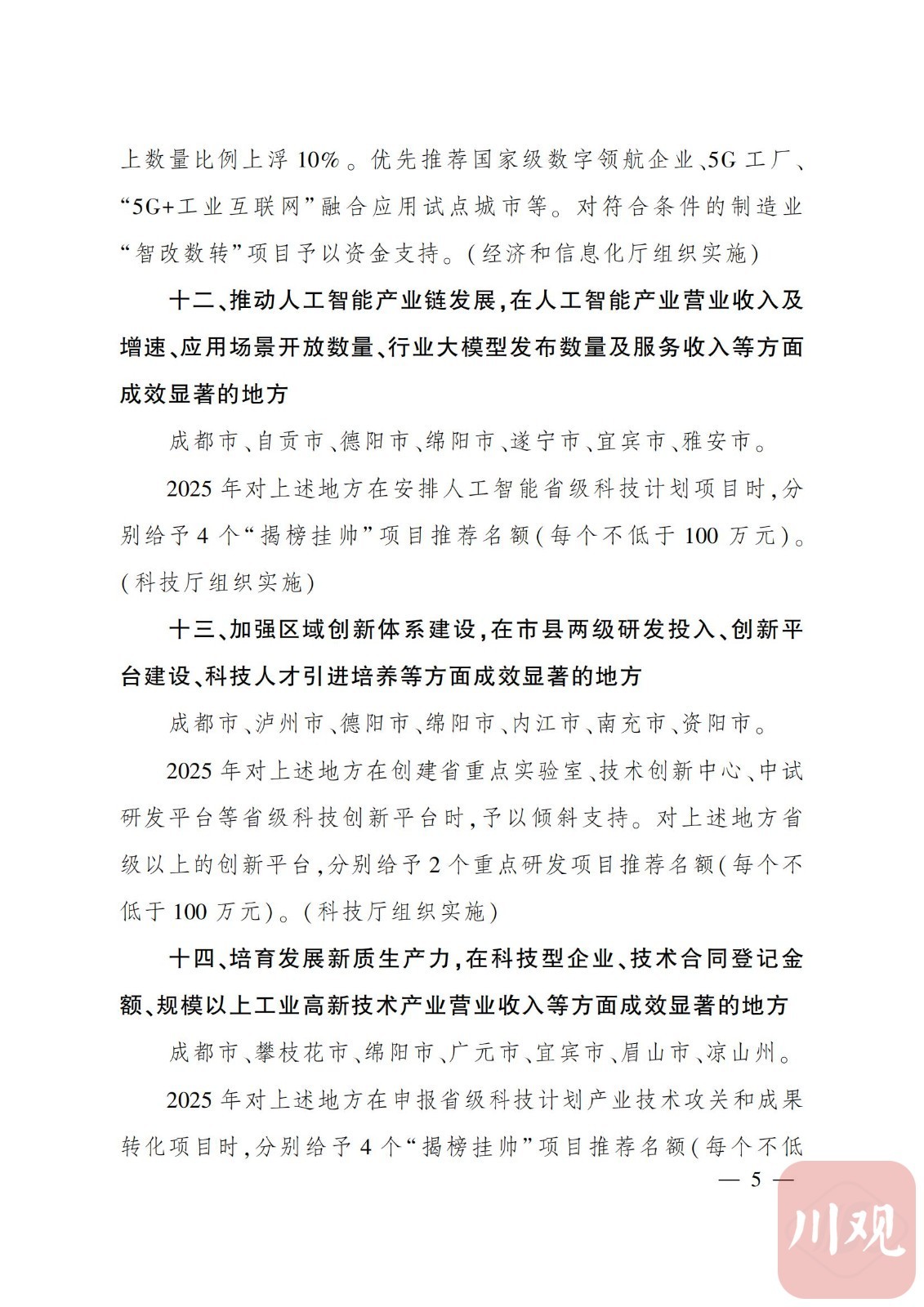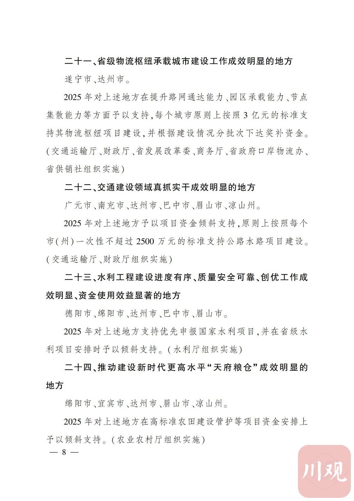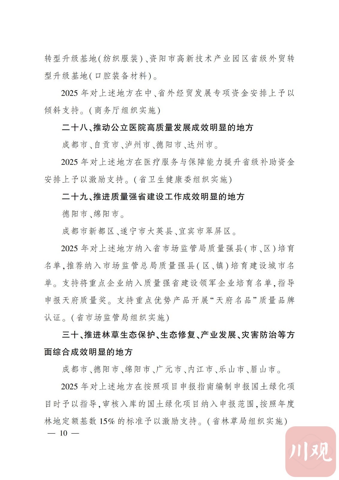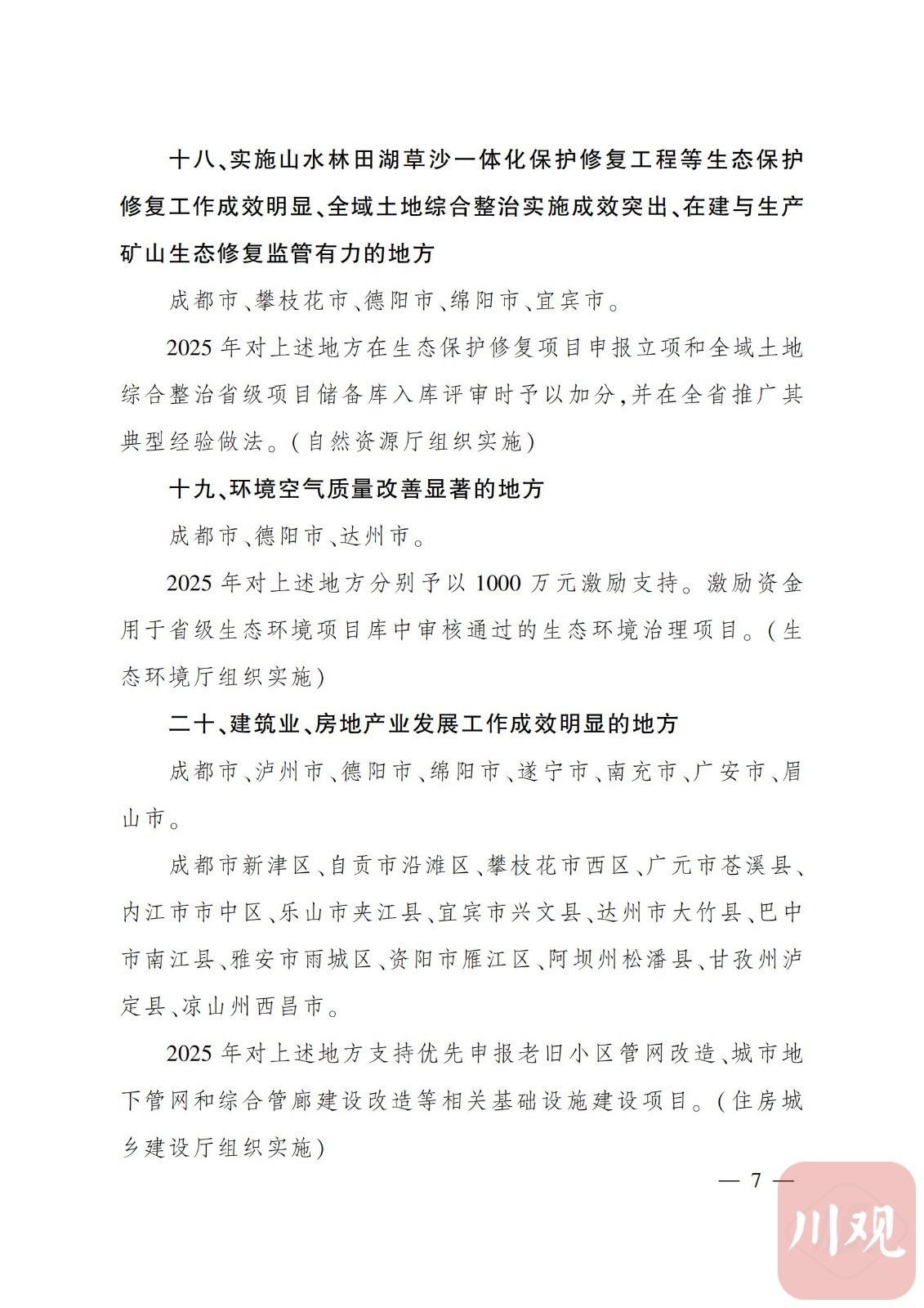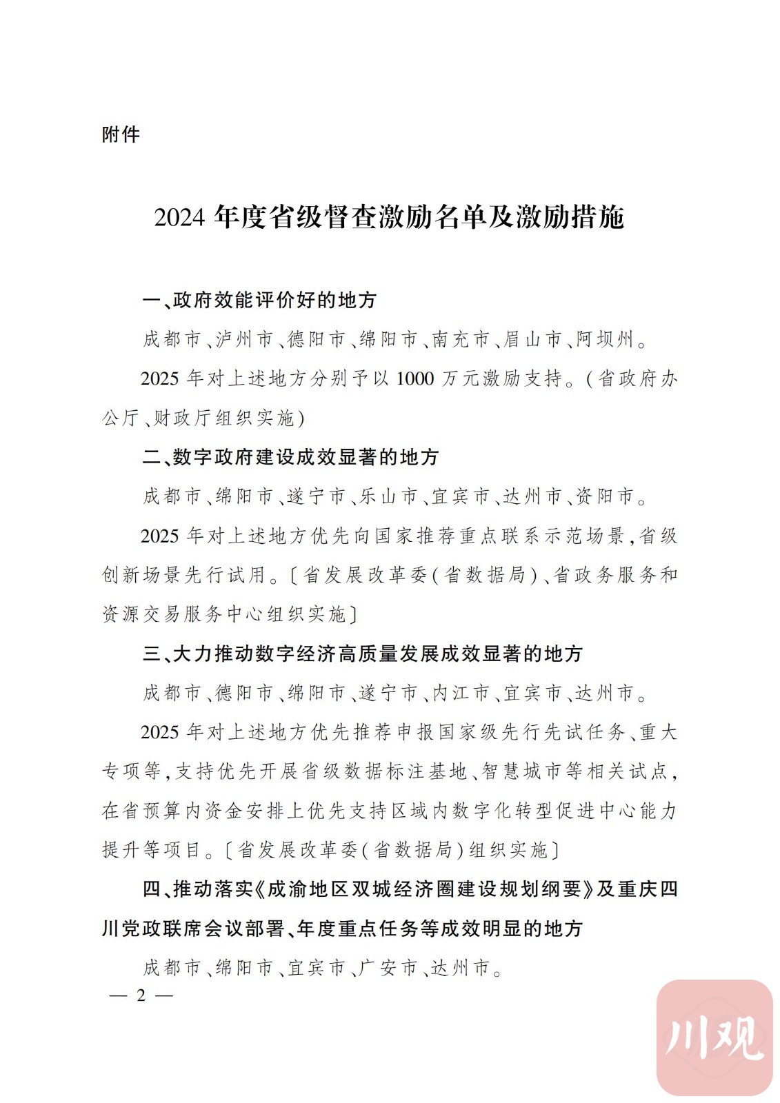為深入貫徹落實(shí)習(xí)近平總書記來川視察重要指示精神,認(rèn)真落實(shí)省委、省政府決策部署,按照《政府督查工作條例》規(guī)定,經(jīng)省政府同意,決定對(duì)2024年度落實(shí)成渝地區(qū)雙城經(jīng)濟(jì)圈建設(shè)、數(shù)字政府建設(shè)、民營經(jīng)濟(jì)發(fā)展、重點(diǎn)產(chǎn)業(yè)鏈發(fā)展等方面有關(guān)重大政策措施真抓實(shí)干、取得明顯成效的21個(gè)市(州)、55個(gè)縣(市、區(qū))予以督查激勵(lì)。