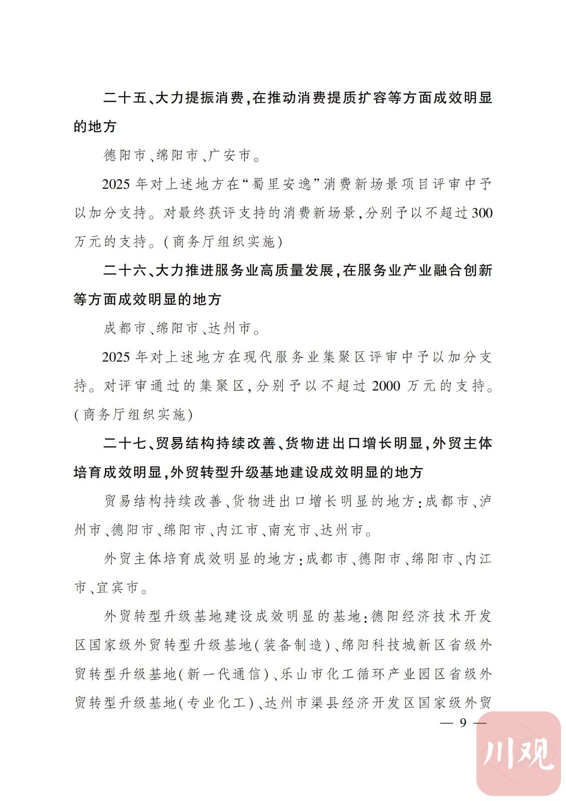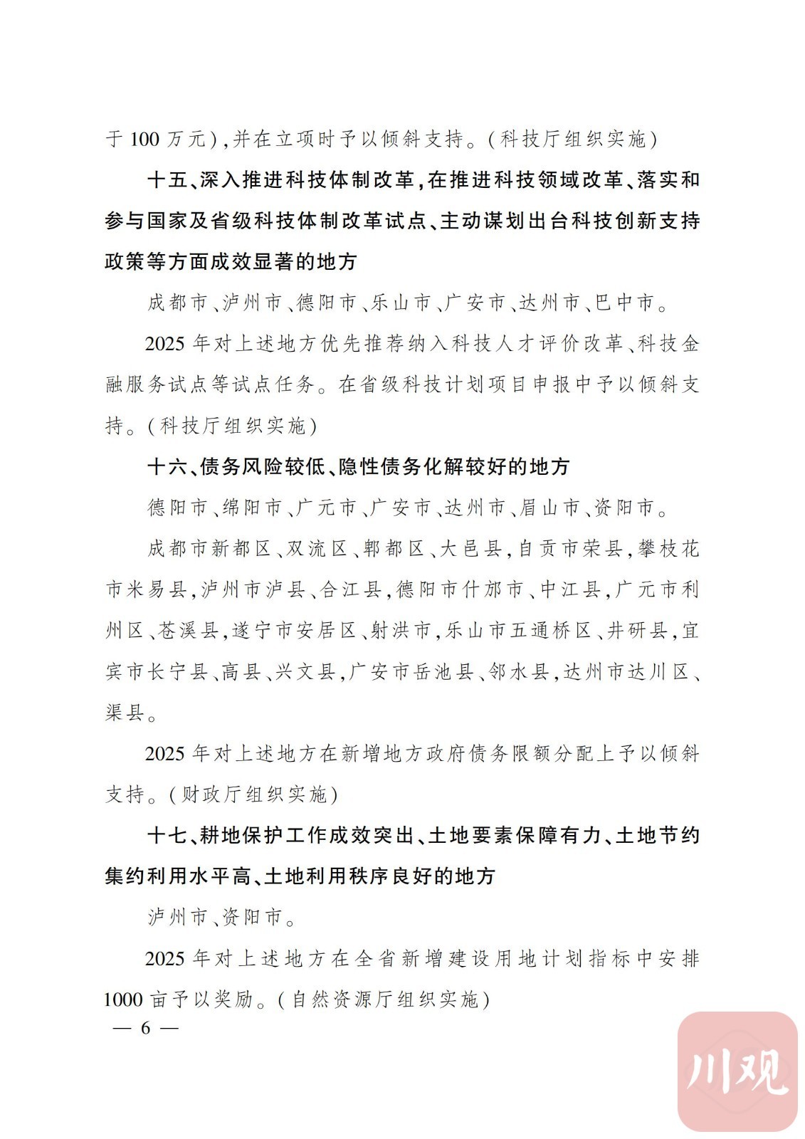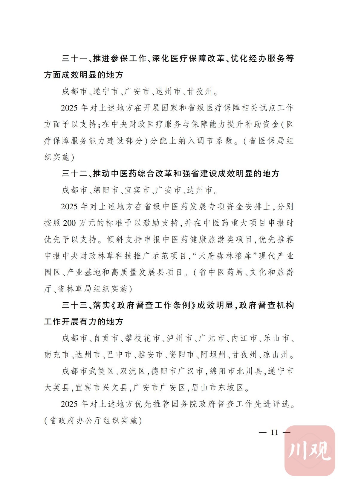4月21日,四川省人民政府網(wǎng)站發(fā)布《四川省人民政府辦公廳關(guān)于對(duì)2024年度落實(shí)有關(guān)重大政策措施真抓實(shí)干成效明顯地方予以督查激勵(lì)的通報(bào)》,對(duì)2024年度落實(shí)有關(guān)重大政策措施真抓實(shí)干成效明顯的21個(gè)市(州)、55個(gè)縣(市、區(qū))予以督查激勵(lì)。具體內(nèi)容如下: