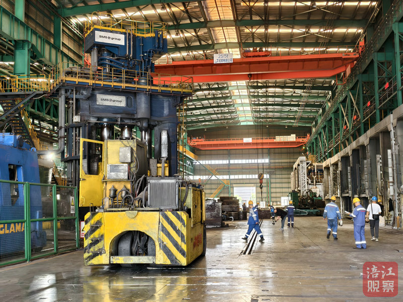 “百煉”之后是“千錘”。記者在六合特材鍛造車間看到,國(guó)內(nèi)最先進(jìn)的自由鍛設(shè)備正在將重達(dá)數(shù)噸的坯料鍛壓變形。據(jù)了解,此快鍛機(jī)最大鍛造壓力可以達(dá)到6000噸,最大鍛造頻次達(dá)到每分鐘115次,裝備的雙操作車可以按照工藝需要進(jìn)行高難鍛造動(dòng)作配合。鍛造可以使高品質(zhì)特種金屬材料內(nèi)部組織更加均勻,以滿足材料耐高溫耐腐蝕嚴(yán)苛的使用要求。