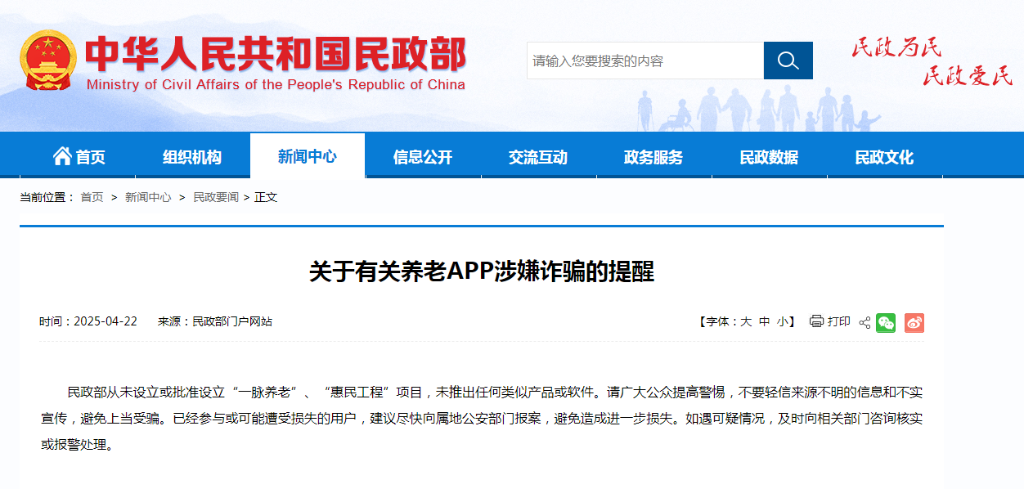 4月22日,民政部發(fā)布公告表示,民政部從未設(shè)立或批準(zhǔn)設(shè)立“一脈養(yǎng)老”“惠民工程”項目,未推出任何類似產(chǎn)品或軟件。請廣大公眾提高警惕,不要輕信來源不明的信息和不實宣傳,避免上當(dāng)受騙。已經(jīng)參與或可能遭受損失的用戶,建議盡快向?qū)俚毓膊块T報案,避免造成進(jìn)一步損失。如遇可疑情況,及時向相關(guān)部門咨詢核實或報警處理。(記者朱高祥)