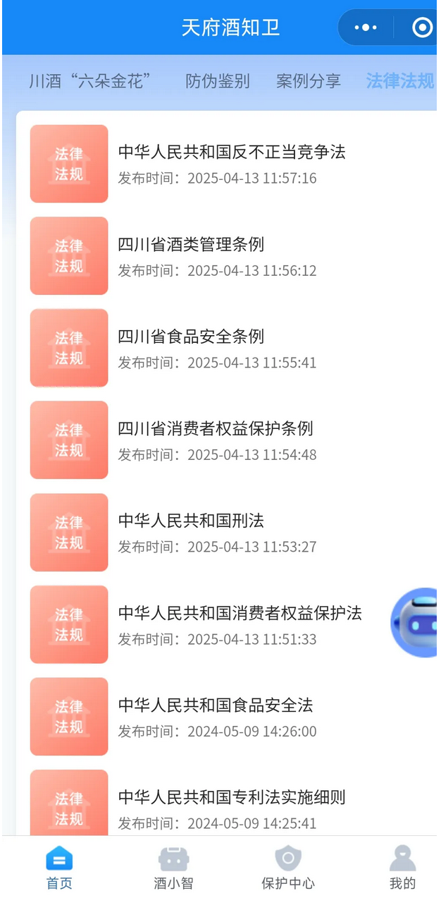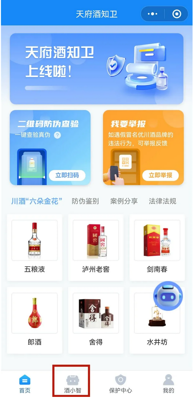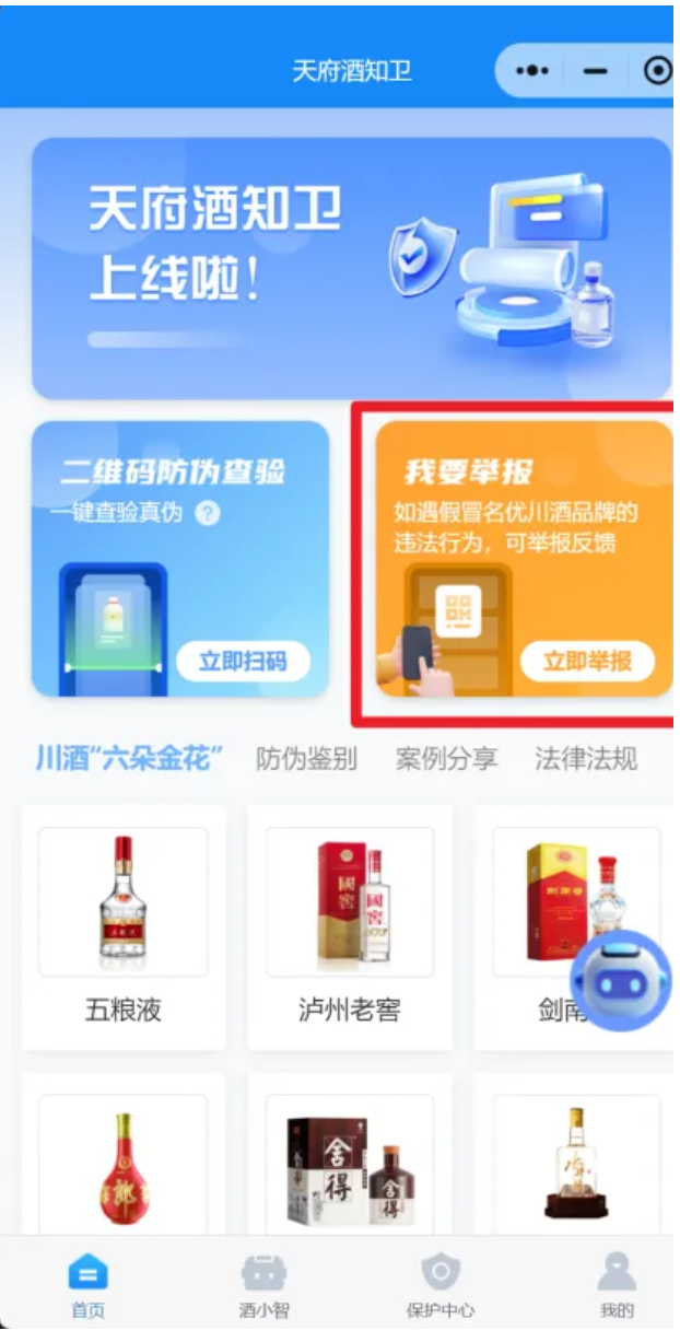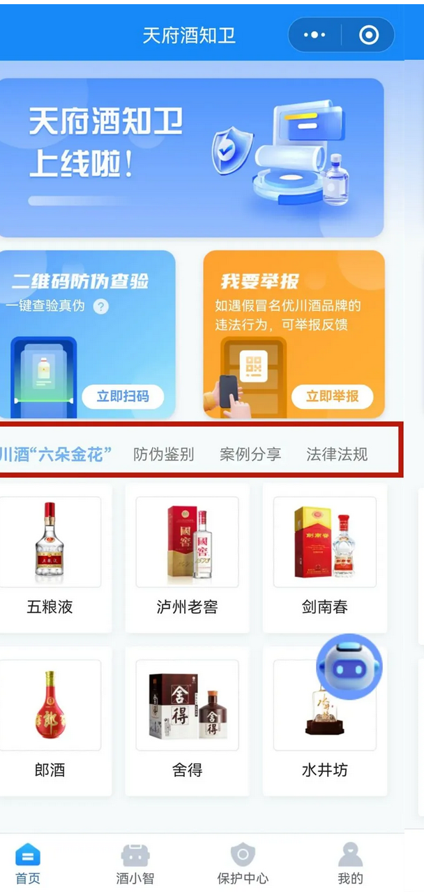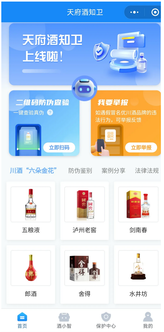 為鏈接消費(fèi)者終端,平臺(tái)還延伸開發(fā)了“天府酒知衛(wèi)”微信小程序。“天府酒知衛(wèi)”微信小程序作為鏈接公眾與川酒知識(shí)產(chǎn)權(quán)監(jiān)督保護(hù)平臺(tái)的重要橋梁紐帶,通過創(chuàng)新“指尖監(jiān)督”模式打通全民參與川酒保護(hù)路徑,以科技助力消費(fèi)維權(quán)。消費(fèi)者可以使用掃碼查驗(yàn)防偽、制售假酒線索舉報(bào)、“酒小智”AI維權(quán)助手等功能,讓每一位愛酒之人都能成為“川酒保護(hù)衛(wèi)士”,共同守護(hù)舌尖上的真品與匠心。