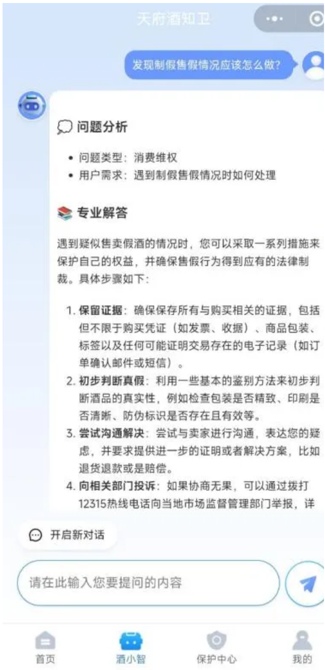 “酒小智”是專門整合了法律法規(guī)、消費(fèi)維權(quán)指引與消費(fèi)糾紛解決等知識(shí)的人工智能工具,全天候提供智能咨詢服務(wù)。通過聯(lián)通大模型技術(shù),“酒小智”可以快速解析用戶訴求并精準(zhǔn)生成建議方案,幫助更好地維護(hù)合法權(quán)益。
