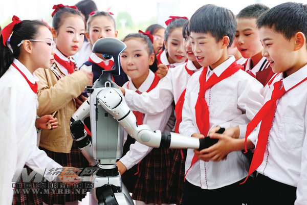 同學(xué)們爭(zhēng)相與機(jī)器人握手